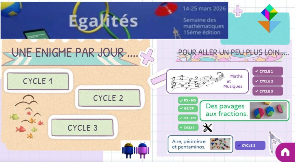 Le groupe départemental de mathématiques du Rhône vous propose des activités originales et attrayantes pour les élèves dans le cadre de la semaine des mathématiques qui se déroulera du 14 au 25 mars 2026 sur le thème « égalités ».
